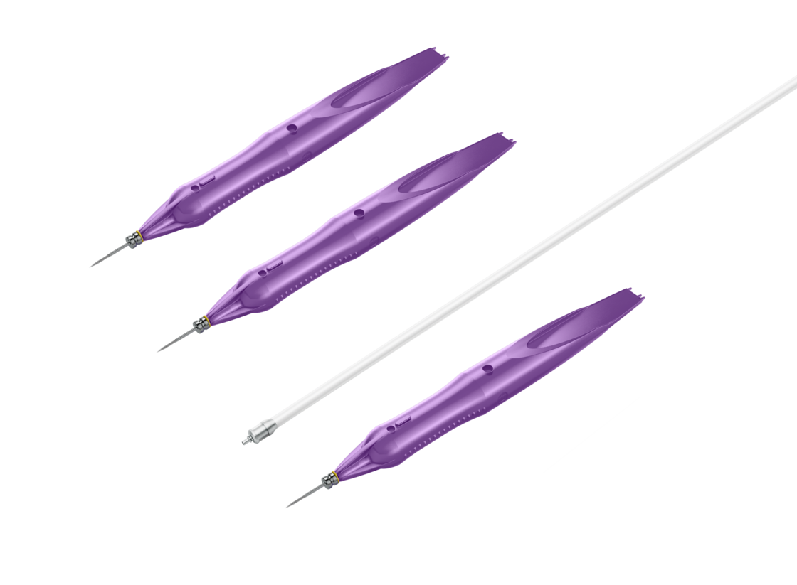 - Tactile markings on the handle for instant orientation of the knife and bevelled cannula *