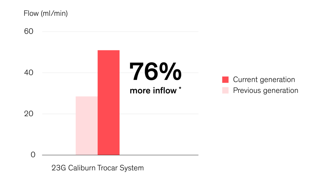 The diagram shows how the Caliburn Trocar System provides 76 % more inflow at 23G compared to the previous Caliburn Trocar System. In combination with the high aspiration performance of the Continuous Flow Cutter, this supports stable intraocular pressure conditions during surgery *.