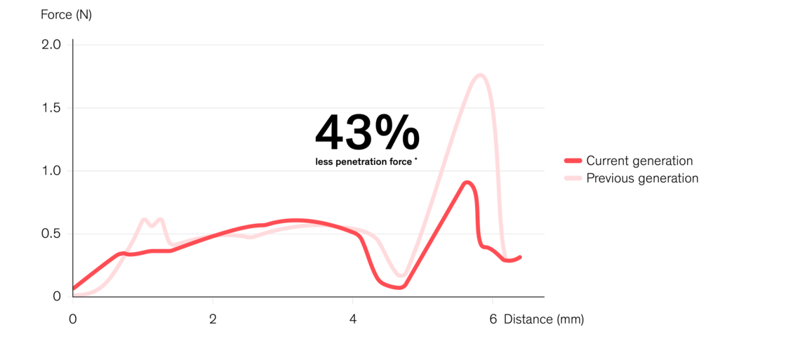 - Bevelled cannula design for up to 43 % less penetration force 1