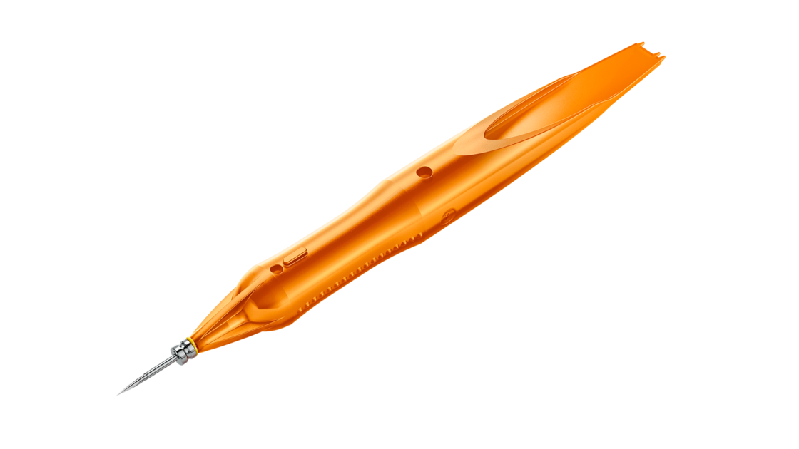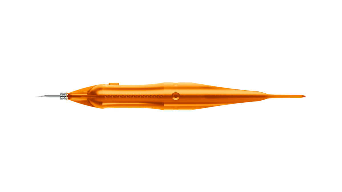 The bevelled cannula is precisely aligned with the knife, enabling accurate insertion of both the knife and the trocar into the sclera. Clear tactile markings on the handle let you immediately feel the correct orientation, eliminating the need for visual control under the microscope 1.